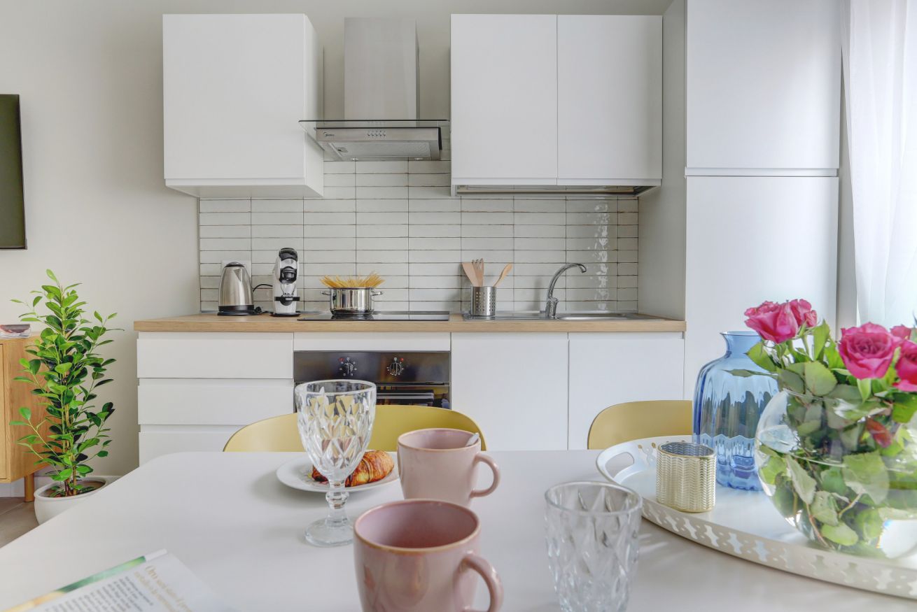 La cucina è completamente attrezzata con lavatrice, microonde, forno, frigorifero e piano cottura a induzione — ideale anche per soggiorni più lunghi o per chi ama cucinare.